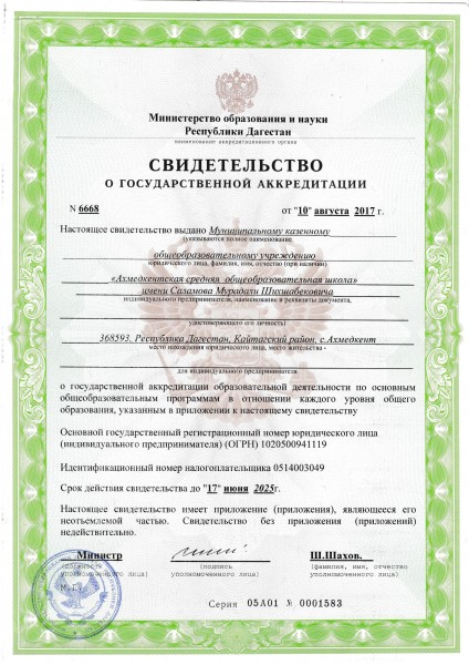 | Полное наименование образовательной организации* | Муниципальное казенное общеобразовательное учреждение "Ахмедкентская средняя общеобразовательная школа имени Саламова М.Ш." |